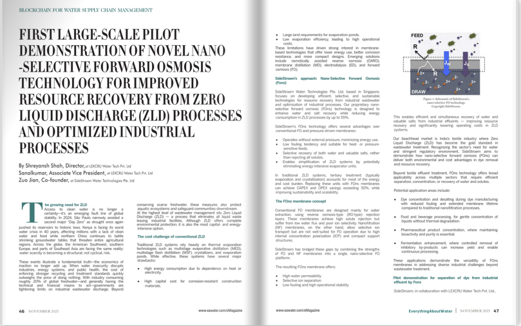 Our first industrial scale pilot with Lexcru Water Tech Pvt. Ltd. was recently featured in the November 2025 issue of EverythingAbout Water (pp 46-48). The 4 inch nano selective forward osmosis elements used were developed in collaboration with The Separation Technologies Applied Research and Translation (START) Centre in Singapore. Contact us for more information on […]